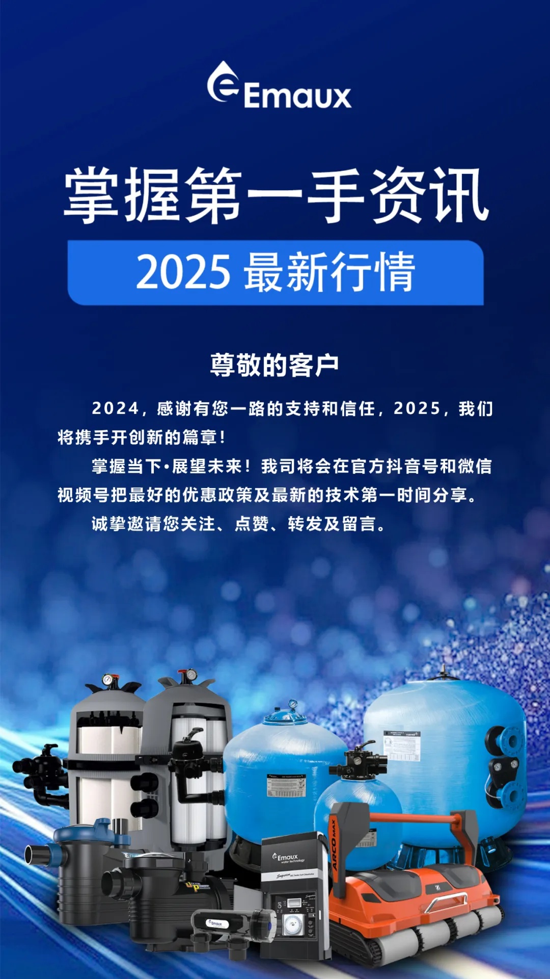 意萬仕集團(Emaux Group),國際水處理行業(yè)領軍企業(yè)之一,我們在游泳池行業(yè)擁有40多年豐富的知識,是一家用心為您提供泳池設備解決方案的專業(yè)生產(chǎn)商, 為全球十大泳池設備供貨商之一。 集團擁有超過10萬平方米的生產(chǎn)基地,集研發(fā)、生產(chǎn)、質(zhì)量控制、培訓, 銷售和售后支持于一體,確保我們的工廠能夠為客戶提供多樣化和創(chuàng)新的泳池和各類水處理設備,滿足高標準的質(zhì)量,性能和設計.